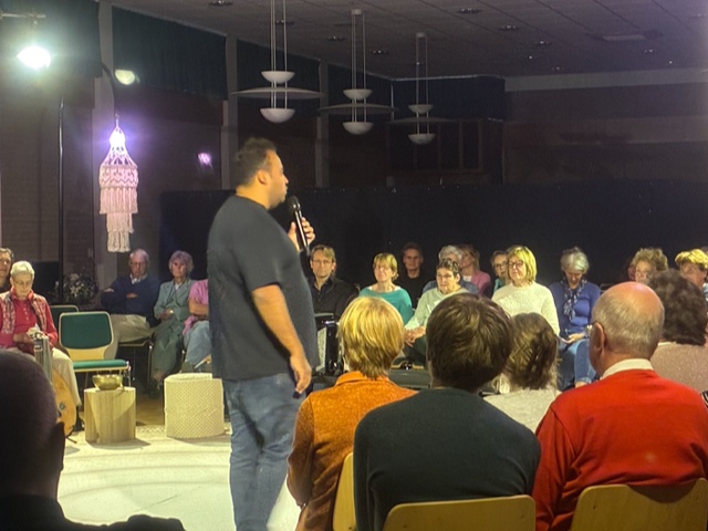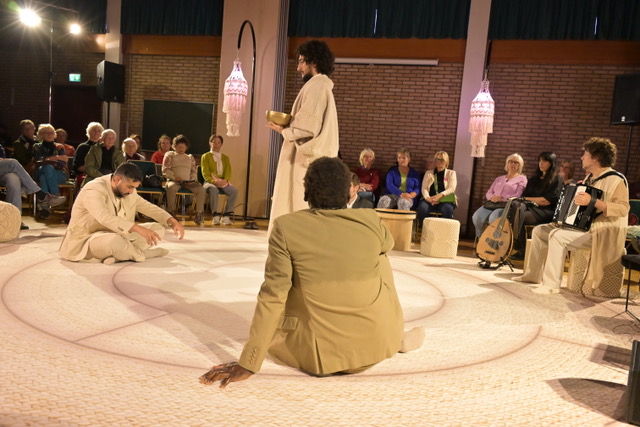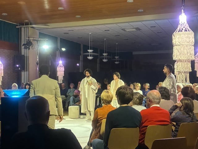 Drie personages, met een christelijke, joodse en islamitische achtergrond, vertelden in krachtige monologen, meeslepende muziek en met poëtische teksten hun verhaal. Het was een indrukwekkende voorstelling, waar je wel stil van wordt. Na afloop was er gelegenheid om in de kring je eigen levensverhaal/ je afkomst te delen. Enkele mensen maakten daarvan gebruik, maar de meesten stonden bij het hapje en drankje in groepjes na te praten.